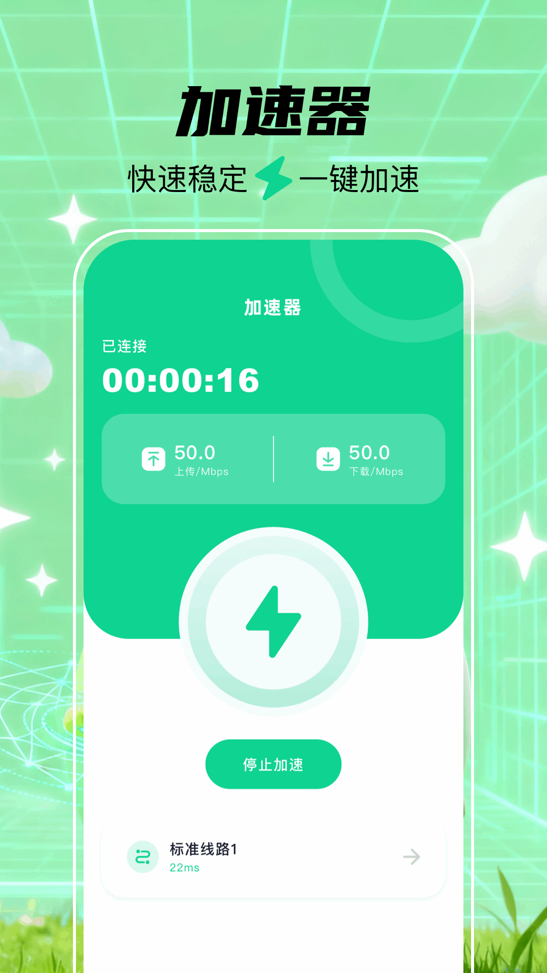 3、一键加速操作。按钮就在界面上。点一下就能连接。整个操作过程不复杂。老人小孩都能用。上手没有什么难度。这个功能,迅速地提升了连接效率。