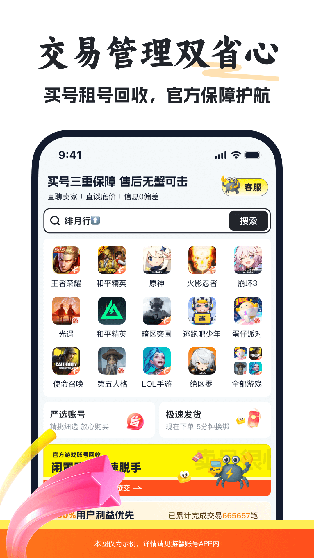 游蟹账号是个专业游戏账号交易平台。小编觉得它主要解决买卖号怕被骗的问题。这里提供一站式服务,让操作变得安心又便捷。用户能在这里放心交易游戏资产。你要知道,安全才是硬道理。这点不能马虎。