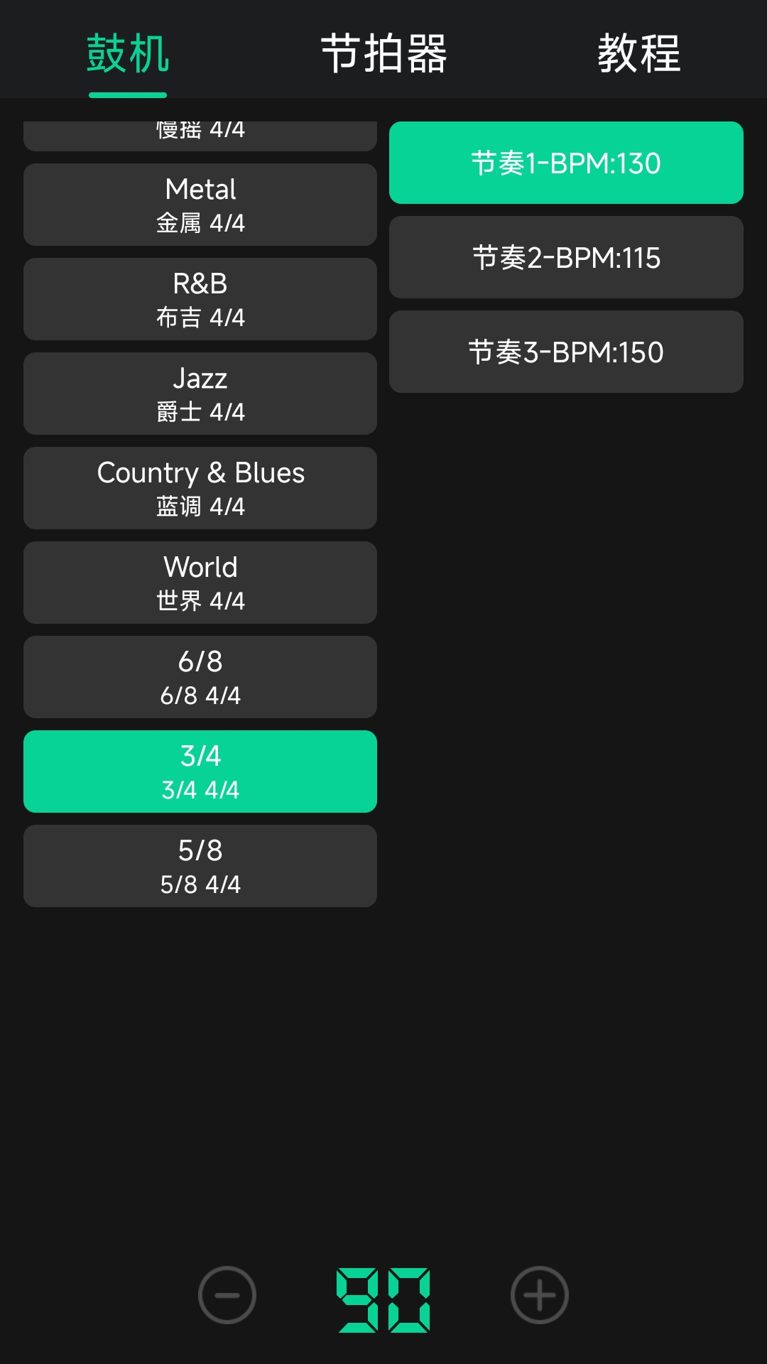 1、支持四二拍和四四拍。这是最常见的节奏型,适合大部分流行歌曲的练习,用户可以直接选用,不用自己去数拍子。