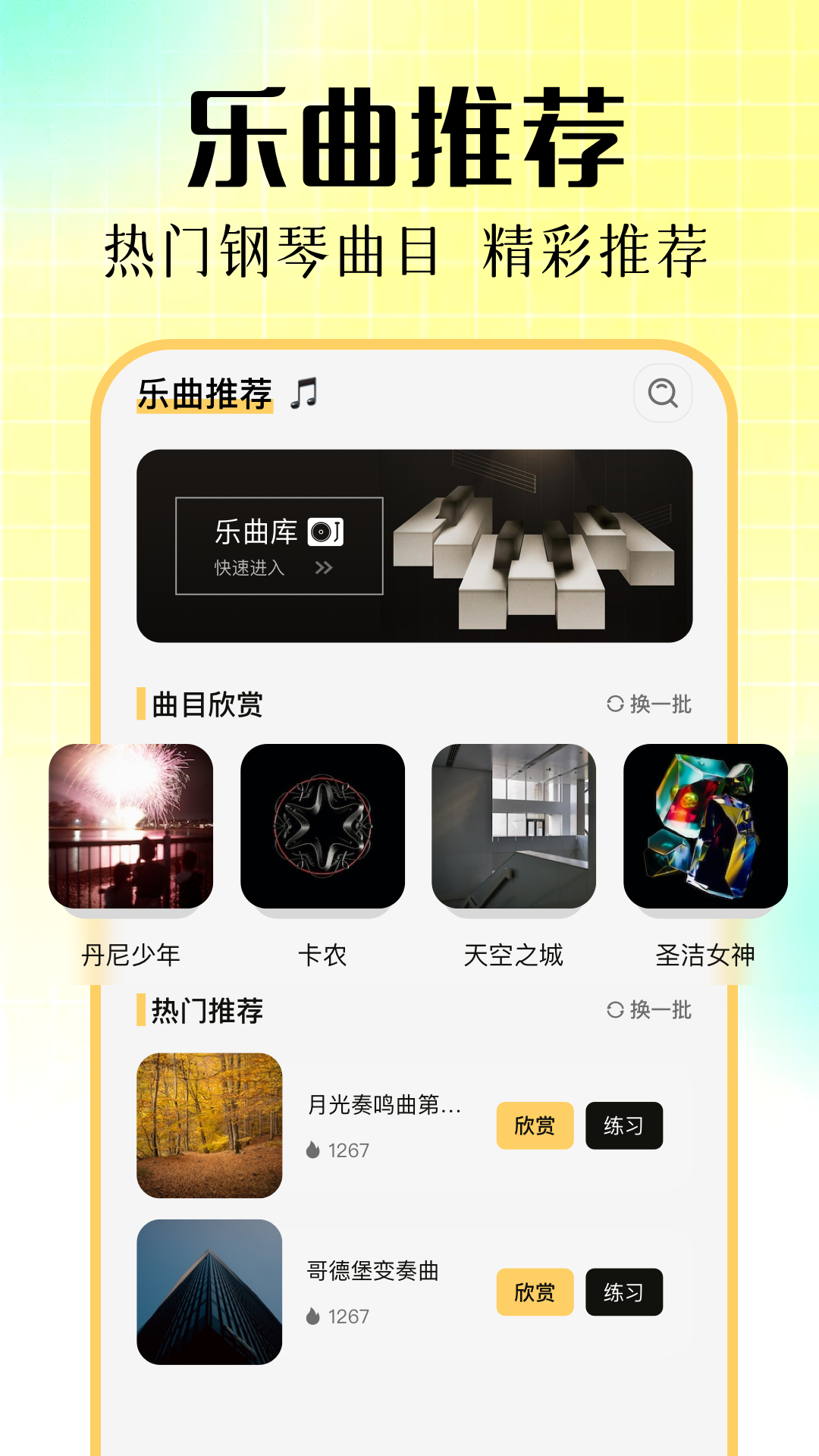 1、热门曲子。流行歌和经典名曲都能找到。用户想弹什么,基本都能搜到。小编发现,里面的分类做得挺细的。找歌不用花太多时间,直接就能开始练。曲库一直在增加。