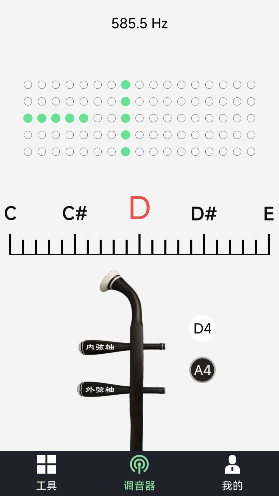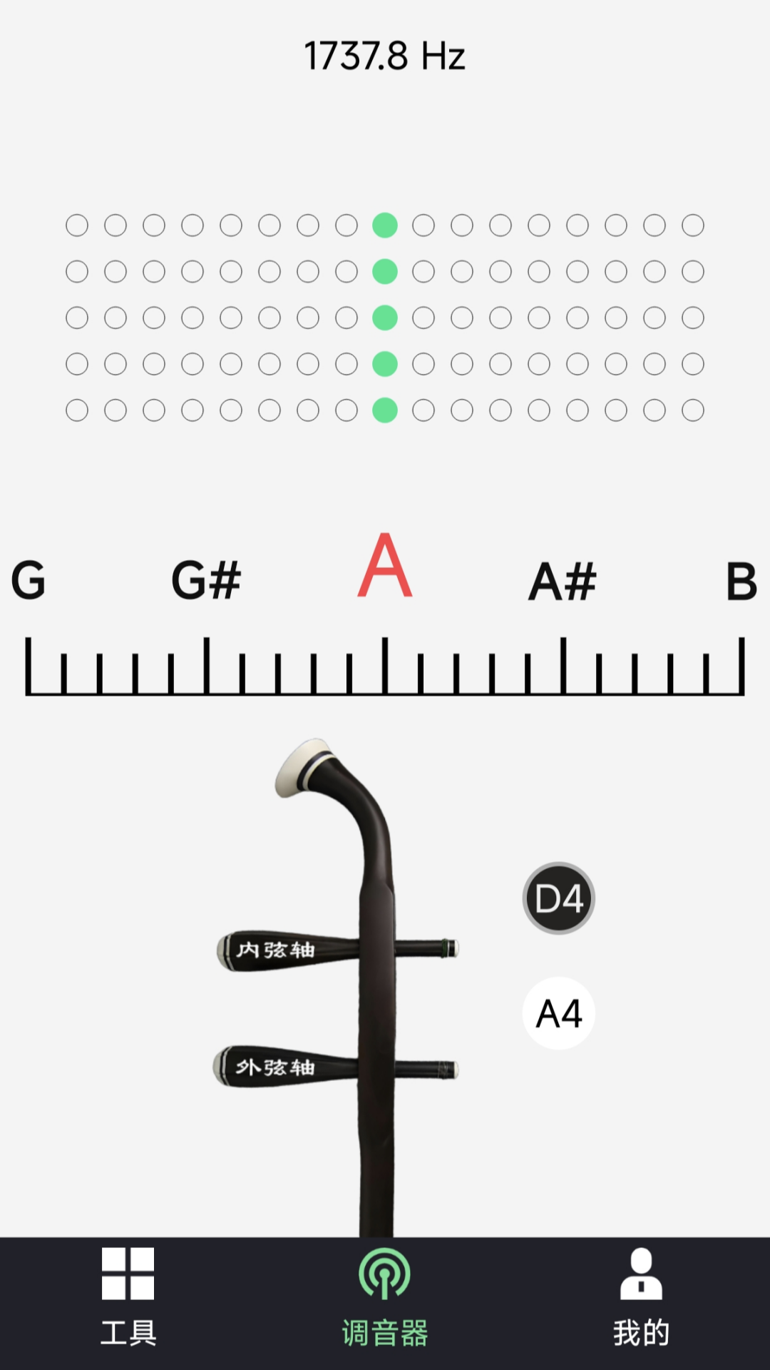 2、D 弦与 A 弦支持。二胡主要是这两根弦,缺一不可,这点大家都知道。在软件界面上,是有 D 和 A 的按钮,点击对应的按钮,就能切换到对应的调音模式,针对性很强,满足基本调音需求,覆盖全面。