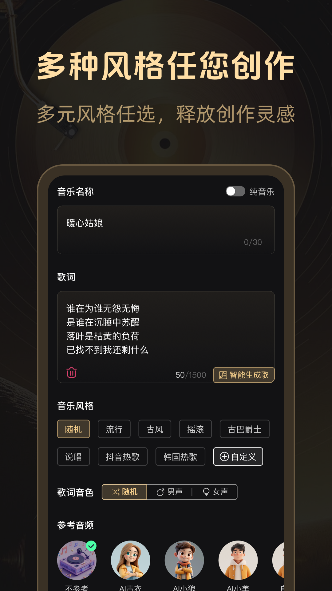 写歌词也是很多用户的难点,这里提供了自动编写功能,帮助解决文字创作问题。