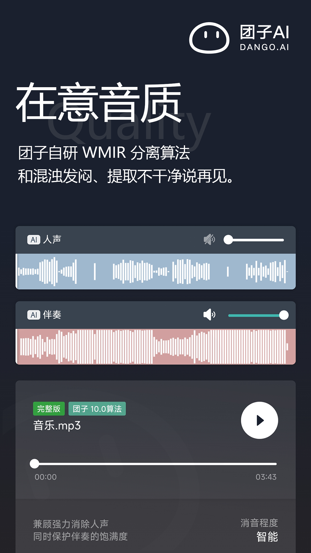 团子 AI 定位就是高质量的音频分离工具。优势在于修复技术和音质保障。适合音乐爱好者或者需要素材的用户。核心价值是把复杂的技术简单化,让每个人都能处理音频。