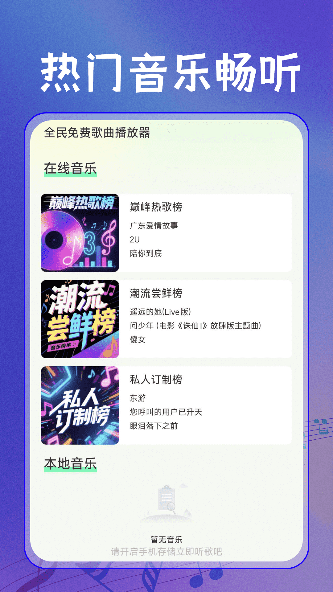 1、全面扫描本地音乐。这个功能,是在用户安装好软件之后,自动去查找手机里存着的音频文件。不需要用户一个一个去翻文件夹,它自己就能把歌单列出来,省去了很多麻烦,找歌变得特别快。