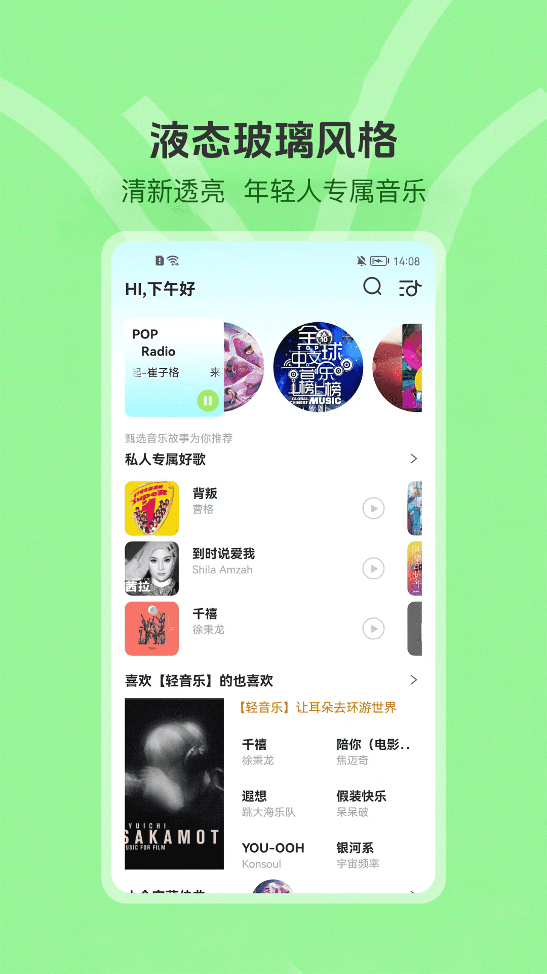 2. 资源方面也不用担心,海量音乐库等着用户。不管喜欢什么类型,都能找到合适的曲目。小编观察过,里面的歌更新速度还算快,热门歌曲基本都有。