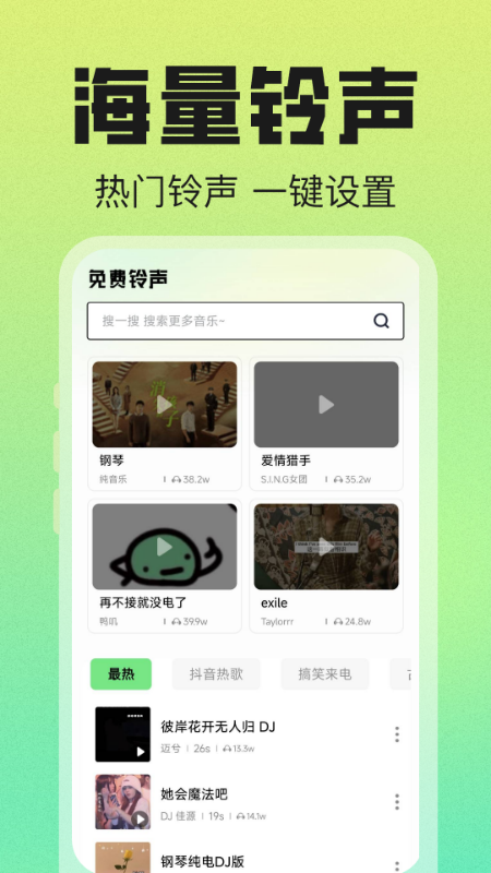 1、网络热门铃声。好多抖音上火的歌这里都有。用户不用到处去搜索链接。直接能在应用里找到源头。更新也比较快。