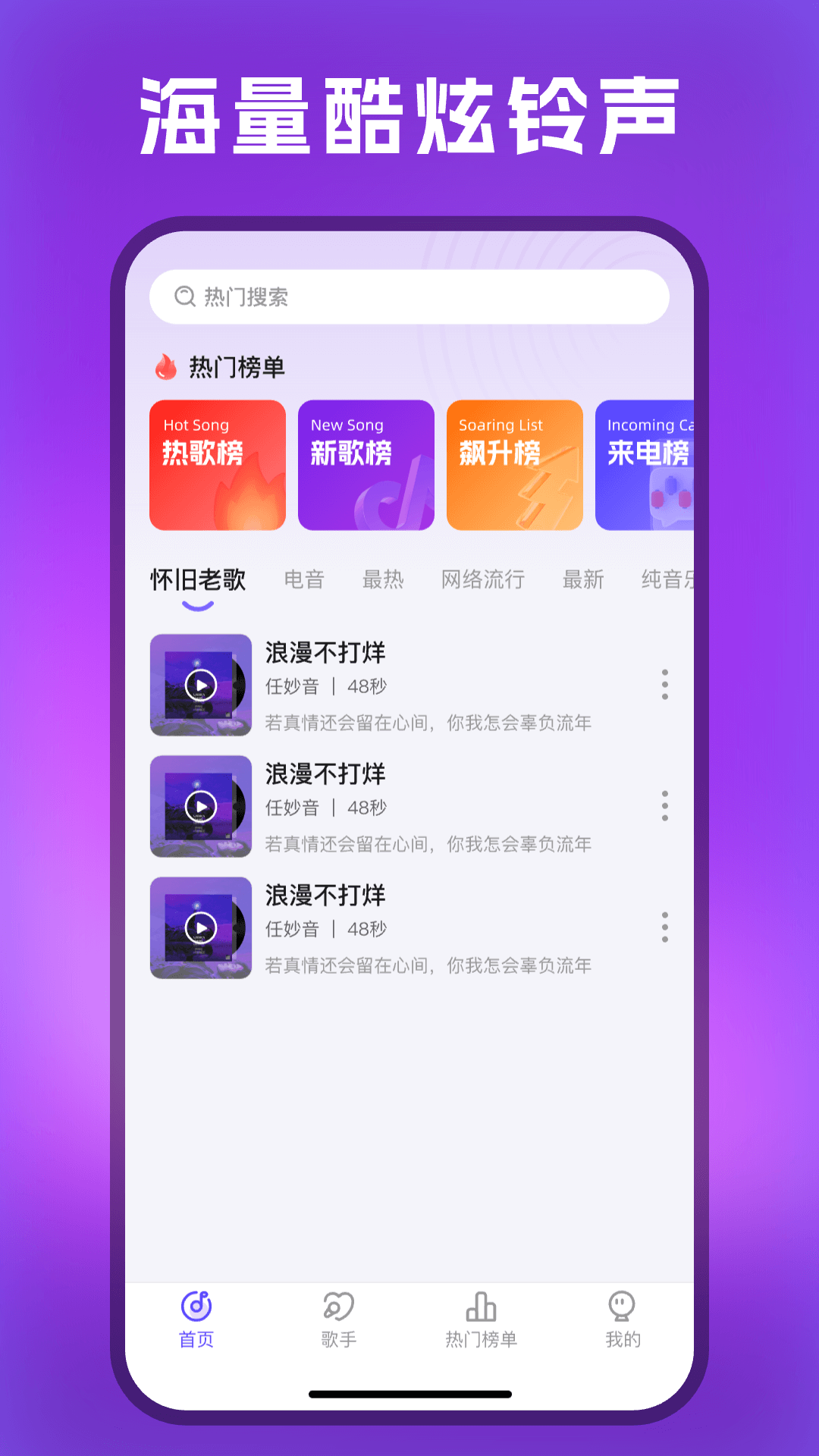 1、热门铃声精选。小编看到里面有很多流行歌曲的片段。都是当下比较火的曲子。紧跟潮流,不会显得过时,别人问起来也知道是哪首歌。
