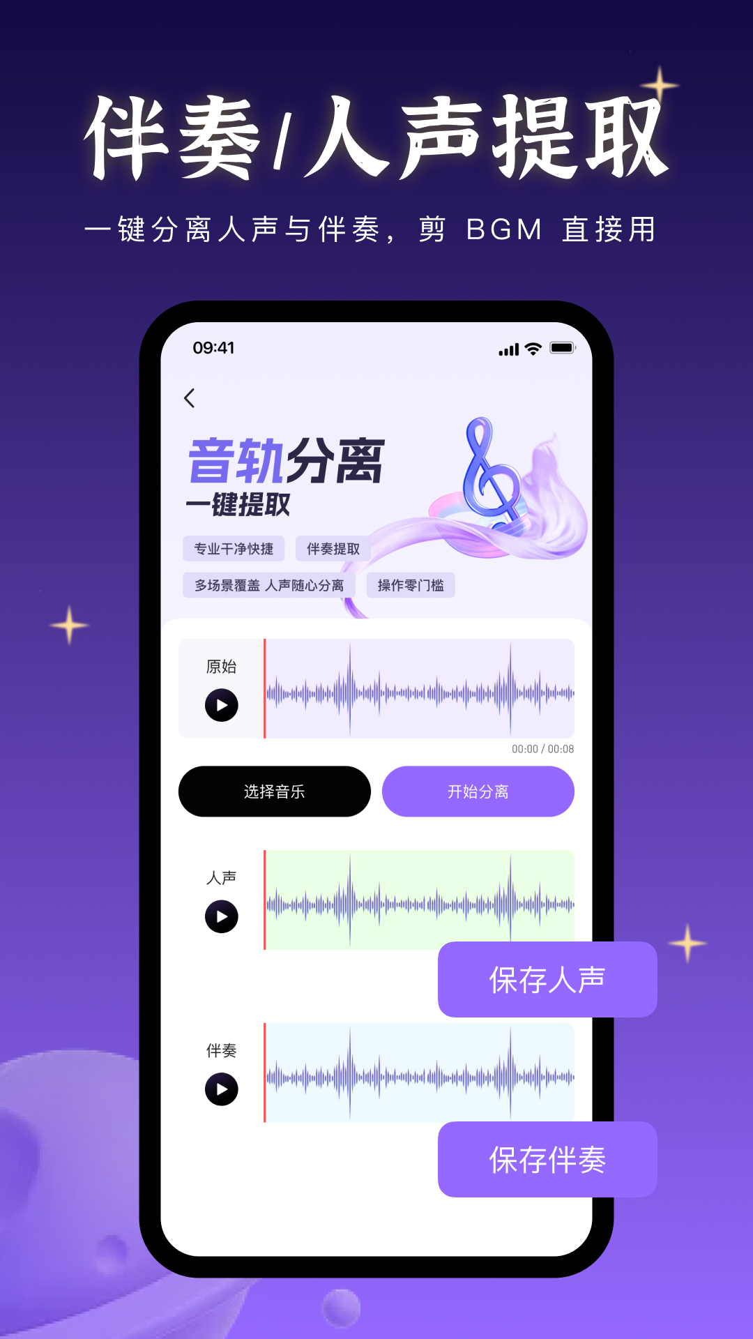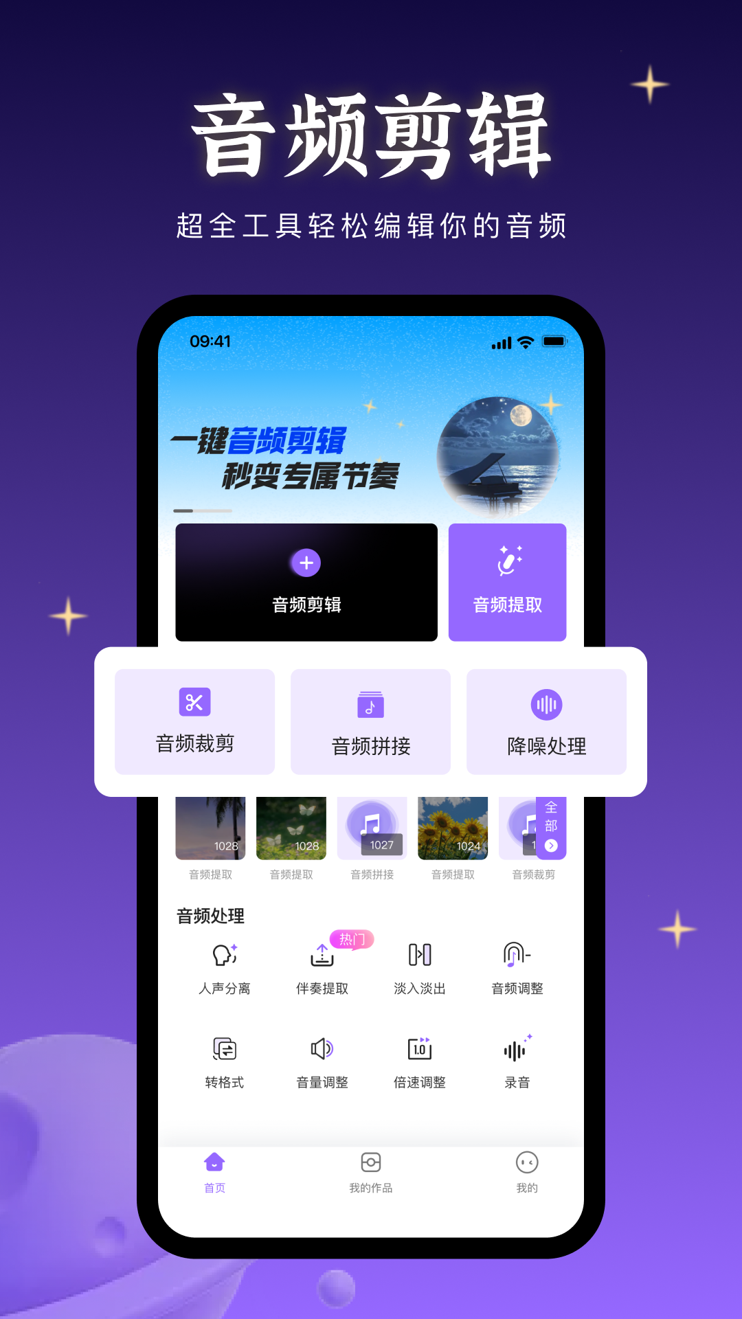 3、音量调节降噪。声音太小可以调大,背景有杂音可以降噪,清理后的音频更干净,听清楚每一个音符,背景更安静。