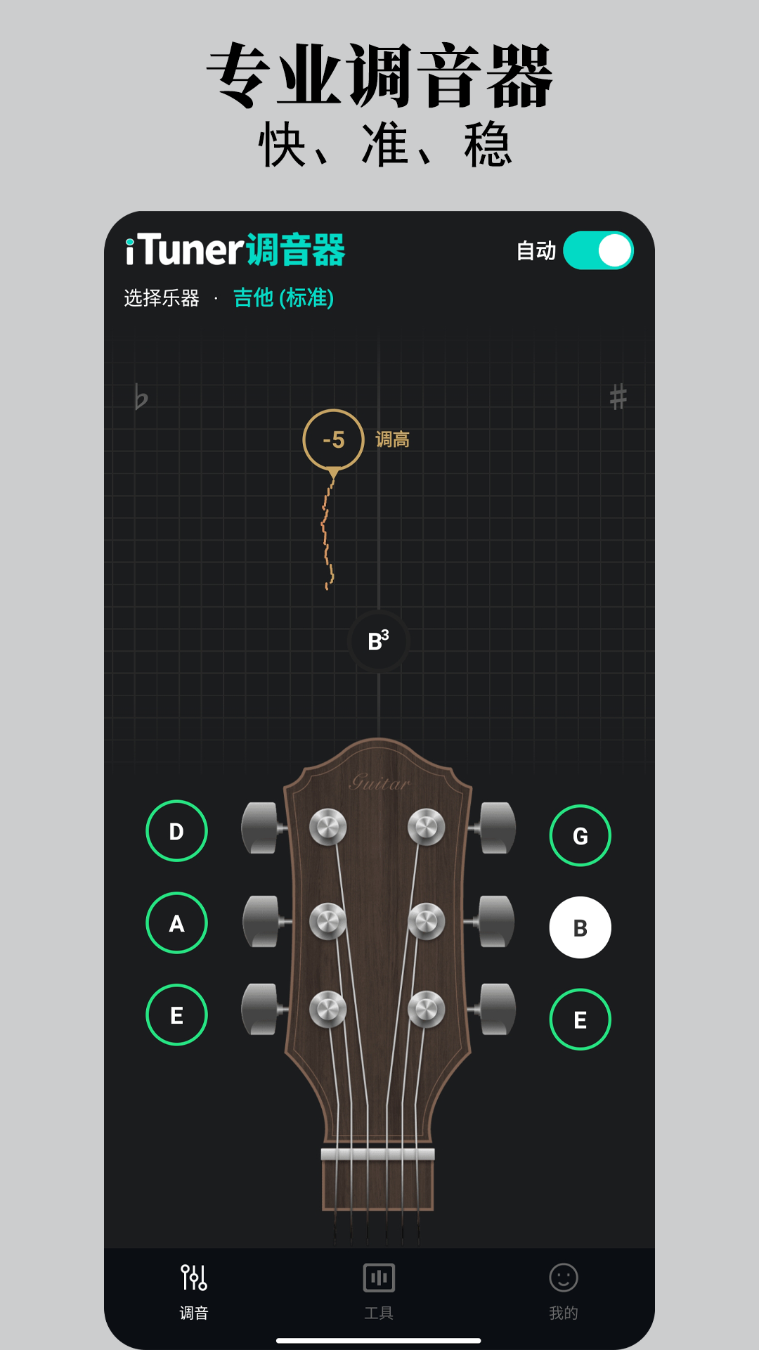 1、专业级调音器。这个功能是用来给乐器定音高的。支持吉他还有尤克里里,连贝斯提琴也能管。小编试过,反应挺快,声音准不准它能听出来。你要知道,调音不准的话,弹什么曲子都不好听,这个工具就是解决这个问题的。