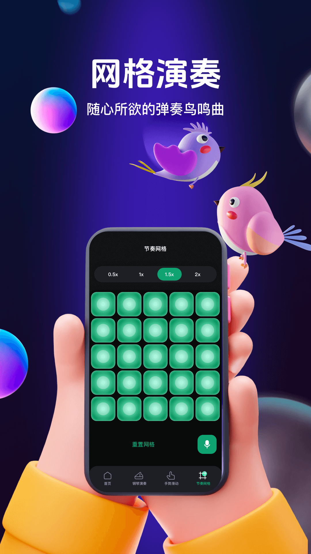 2、网格演奏功能。用户能随心所欲地弹奏鸟鸣曲,打造专属的节奏,这个功能让用户有更多的自由度,想怎么弹就怎么弹,不用担心弹错音符,创作变得很简单。