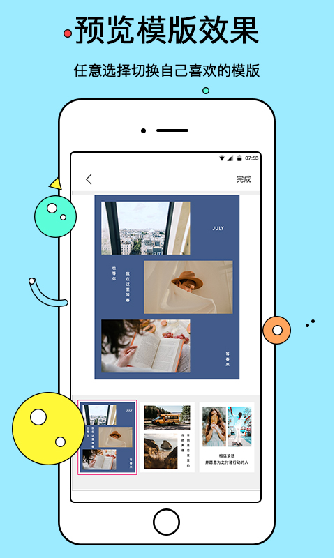 1、音乐相册功能支持时尚多样化的主题风格。用户可以选择结婚请帖或者毕业照模板,让视频故事更加生动,小编试过几个模板,效果确实不错。