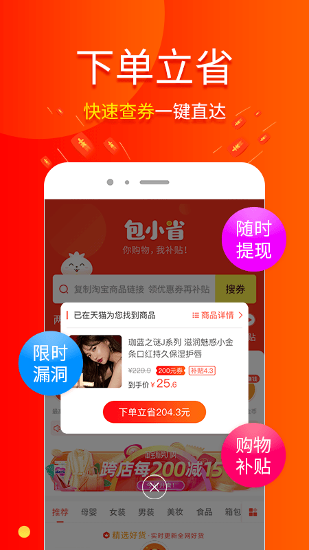 包小省首页像一个不断滚动的省钱盲盒:今日爆款返利榜、新人专享0元购、限时秒杀神券区、本地生活福利(美团饿了么也能领)、甚至还有“学生党专属”“宝妈囤货清单”“打工人午休必抢”这类精准栏目。它不堆数据、不讲算法,就用大字报+红气球+叮咚音效告诉你:“这个洗发水,省19块!”“这家烧烤店,代金券立减30!”操作也极简——搜索商品名→点“领券购买”→跳转下单→坐等返现。连“怎么提现”这种问题,APP里都做成带语音解说的动画小教程,点开就播,比看我妈发的养生视频还清楚。而且它真的天天更新,凌晨两点都在上新券,周末不放假,春节不打烊,双十一前一周更是疯狂加码,有些券比平台主会场还早两天放出,手快有,手慢拍大腿。